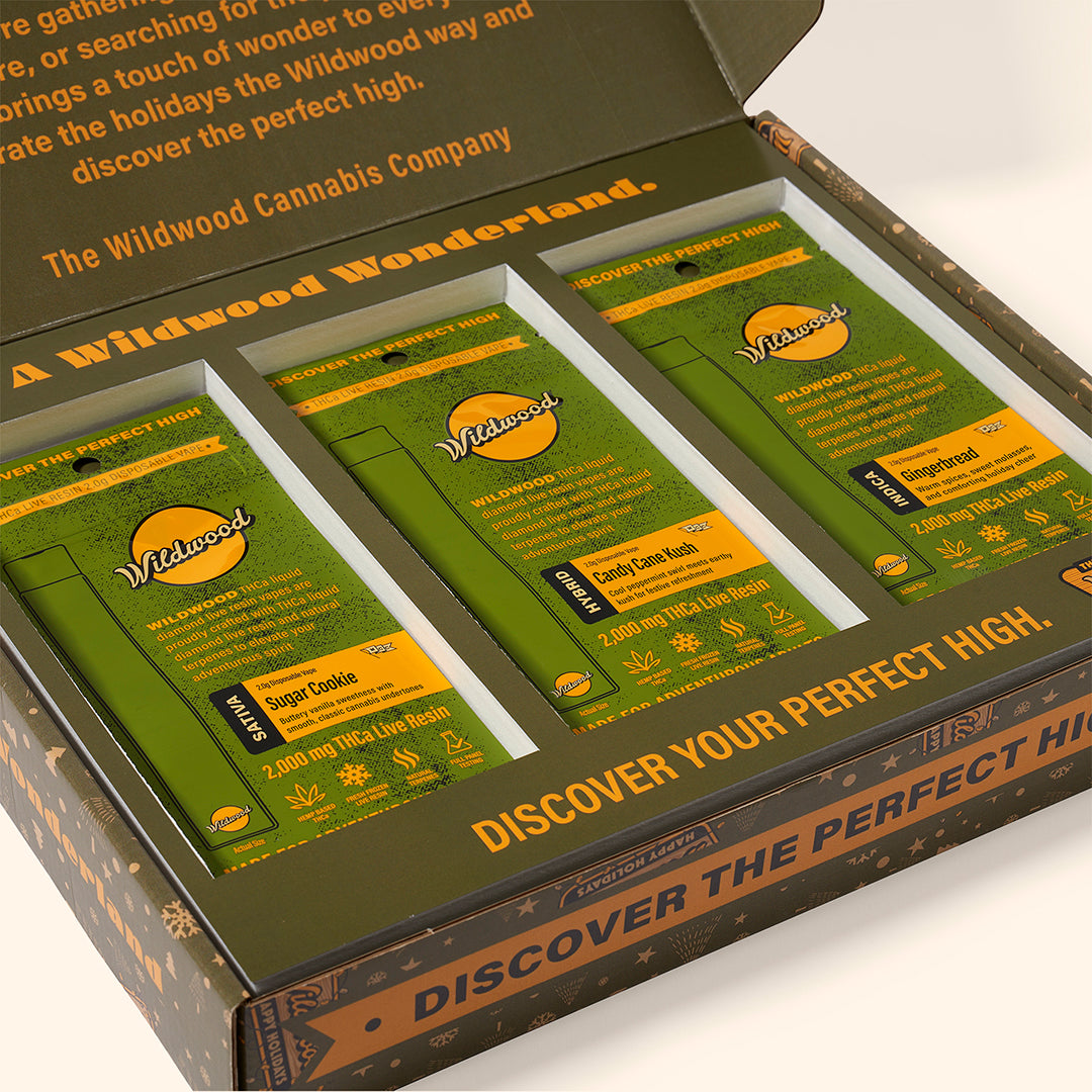 Celebrate the season in style with Wildwood’s Winter Wonderland 3-Pack Gift Box — a limited-edition collection featuring all three of our festive THCa Liquid Diamond Live Resin 2.0g disposables: Candy Cane Kush, Gingerbread, and Sugar Cookie.